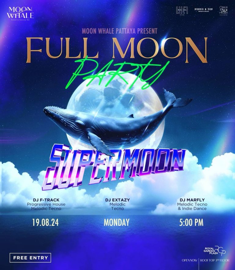เตรียมตัวให้พร้อมสำหรับปาร์ตี้ฟูลมูนสุดร้อนแรงที่พัทยา ณ รอยัล การ์เด้น พลาซ่า พัทยา วันที่ 19 สิงหาคม 2024! มาเต้นให้สุดเหวี่ยงใต้แสงซูเปอร์มูนกับดีเจสุดมันส์ของเรา งานนี้เข้าฟรีตั้งแต่ 17.00 น. ถึง 01.00 น. ที่ Moon Whale, รอยัล การ์เด้น พลาซ่า พัทยา