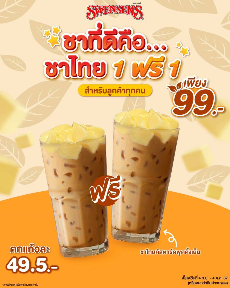 สั่ง ชาไทยคัสตาร์ดพุดดิ้งเย็น 1 ฟรี 1 เพียง 99.- (ปกติ 198.-) ตกแก้วละ 49.5.- สำหรับลูกค้าทุกคน! ชาวชาไทยเลิฟเวอร์รีบชวนเพื่อนไปหารเล้ยยยย ชาไทยคัสตาร์ดพุดดิ้งเย็นชาไทยสูตรเข้มข้นชงสดใหม่ทุกแก้ว หวาน หอม มัน กลมกล่อม ท็อปล้น ๆ ด้วยคัสตาร์ดพุดดิ้งเด้งดึ๋งดั๋ง อร่อยยยเพลินจนยั้งใจไว้ไม่อยู่ ตั้งแต่วันที่ 4 ก.ย. – 4 ต.ค. 67 (หรือจนกว่าสินค้าจะหมด) .